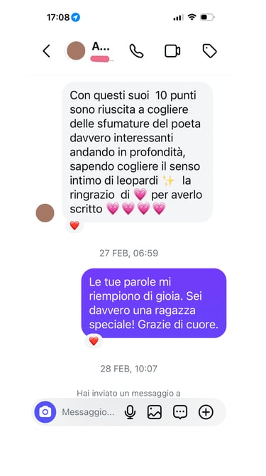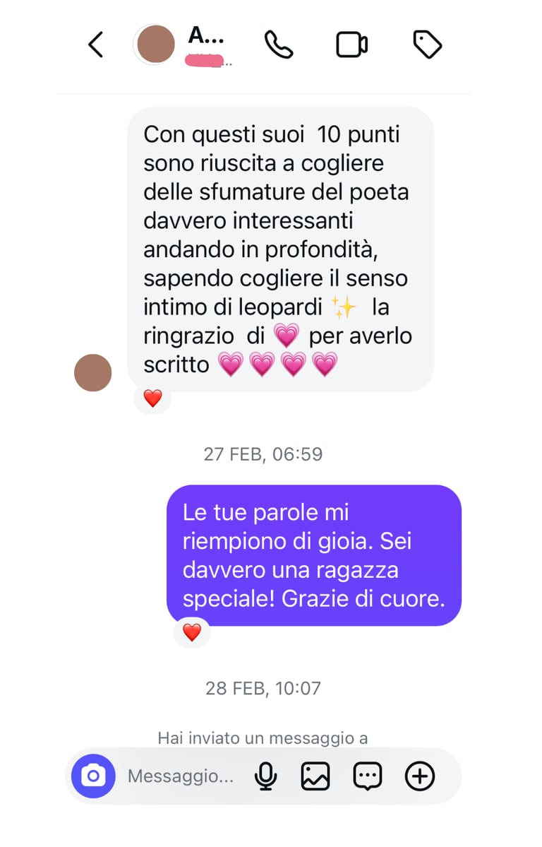 Buongiorno Carla, desidero esprimerti il mio sincero apprezzamento per il tuo saggio su Leopardi. Mi ha commosso! L'ho letto e riletto ed ho sentito la tua delicata partecipazione emotiva.